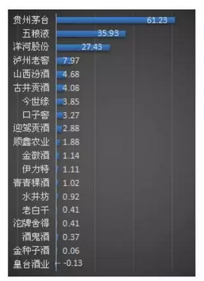 茅臺(tái)依舊一枝獨(dú)秀,其凈利潤(rùn)接近于除開(kāi)五糧液而外,其他全部17家企業(yè)的總和,茅臺(tái)為61.23,除五糧液而外其他17家企業(yè)總利潤(rùn)為61.35億元。