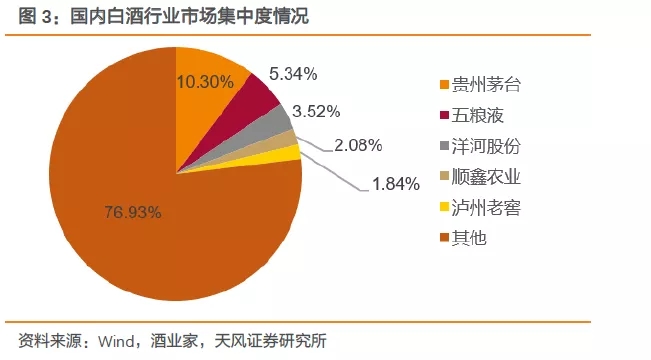 國內白酒行業集中度較低,存在較大空間。2017年,我國規模以上白酒企業達1593家,實現銷售收入5654.42億元。小微型白酒生產企業數量較多,行業分散化程度高。同年,國內營業收入排名前十的上市白酒企業(貴州茅臺、五糧液、洋河股份、順鑫農業、瀘州老窖、古井貢酒、山西汾酒、口子窖、迎駕貢酒、今世緣)營收總和達到1531.50億元,占該年度1000余家規模以上白酒企業營收的27.09%。