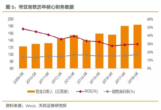 帝亞吉歐(Diageo)是全球最大的洋酒企業,旗下擁有蒸餾酒、啤酒等一系列200余項酒類品牌,包括尊尼獲加(Johnnie Walker)、斯米諾(Smirnoff)、摩根船長(Captain Morgan)、百利(Baileys)等世界頂級名酒。公司現已占據全球近1/3的洋酒市場份額,在世界酒類市場中地位顯赫。17-18財年,公司實現營收184.32億英鎊,歸母凈利潤達到30.22億英鎊,市值截至19年2月13日高達805億英鎊。