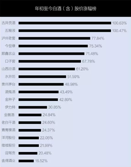 看上圖,截止2019年5月27日收盤,股價漲幅前三位的依次是:古井貢酒100.63%、五糧液100.47%、瀘州老窖77.84%。漲幅最小的,舍得酒業也有16.52%。