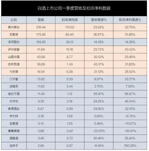 一是業績好。白酒上市公司的2018年報、2091一季報財務數據均是非常的“漂亮”,尤其是貴州茅臺、五糧液、瀘州老窖、山西汾酒、古井貢酒等龍頭酒企,在高規模、高基數之上,一季度營收、扣非凈利潤同比高增,超市場預期。