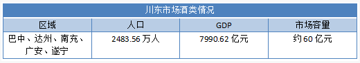 據(jù)四川省酒類流通協(xié)會(huì)及川東部分酒商透露,川東5市的酒類容量約60億元,且分為山地型、丘陵型兩類市場(chǎng)。