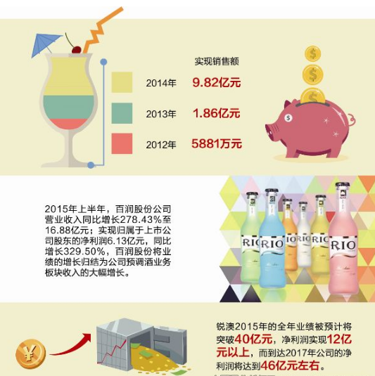 銳澳雞尾酒2012年全年銷售僅實現5881萬元,2013年達到1.86億元,2014年實現銷售額大幅翻番,實現銷售額9.82億元,實現利潤2.3億元。
