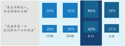 第四,盡管互聯網在三四線城市和農村普及率較低,但這些地區的大部分消費者都在使用電子商務,網購的比例分別達到了68%和60%。農村用戶中的“網絡達人”更是比一線及二線城市多出25%,渴望第一個嘗試新的產品和服務。