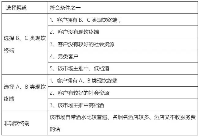 示例:如果競品的主要渠道在A類酒店,并且買斷了絕大多數(shù)A類酒店。這時我們就要避開A類酒店,結(jié)合經(jīng)銷商的優(yōu)勢資源,選擇B、C類酒店或者商超、名煙名酒店為主要渠道。