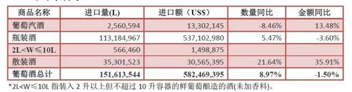 葡萄酒進口整體維持小幅跌勢。瓶裝酒量額漲跌幅度較小,散裝酒量額升幅較大,葡萄汽酒量額互有漲跌。瓶裝酒進口額5.4億美元,占葡萄酒進口總額92.2%,同比下降3.6%。