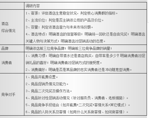 – 活動:業務員負責與酒店做好溝通,尋求支持,按要求在核心酒店開展一店一策消費者品嘗活動,促銷員按活動要求向消費者贈送品嘗酒,并做好相關登記,業務員每天對活動進行評估、報告,并提出合理化建議。