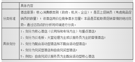 – 客情:核心酒店必須在一周內、重點酒店必須在半月內建立關鍵人物(服務員、大堂經理、老板)檔案資料,促銷員必須建立常客資料,要求每周常客一名(重點酒店每兩周一名),并納入核心店促銷人員考核,業務員每天必須有特定的客情對象,并于日報表反映每天的客情進展,提出客情強化方案,按要求申請費用,選擇客情方式。
