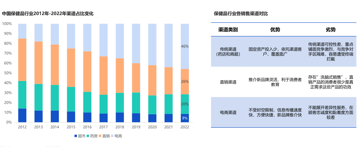 直銷、商超和藥店、電商是保健食品三個主要的銷售渠道。隨著消費者健康意識和保健相關知識的提升,電商渠道憑借品類選擇多樣、方便快捷和優惠價格等優點占比逐年提升,未來隨著保健品消費需求更加年輕化以及保健品品牌重心往線上轉移,電商渠道有望持續高速增長?聪旅娴那勒急茸兓约扒缹Ρ龋沮厔菁疤攸c就一目了然了。