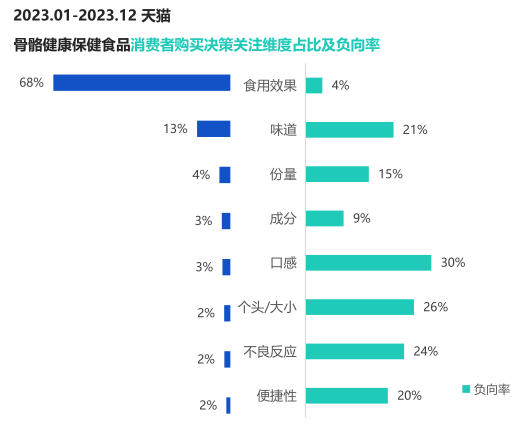 食用效果是骨骼健康消費者最關注的維度,占比達68%,部分消費者反饋產品對于緩解中老年人骨骼、關節疼痛有效,另有部分消費者反饋產品對于促進孩子長高有效。從負面反饋來看,消費者對于產品的口感、個頭/大小、不良反應、味道等方面提出不滿較多,如認為產品味道不佳,難以下咽,或是產品顆粒過大,難以吞服,口感不佳,而不良反應方面,食用之后便秘被提及最多。