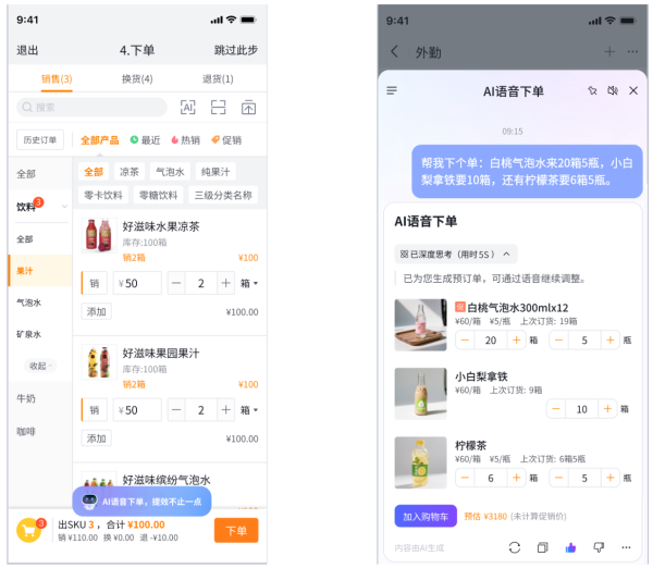 場景案例:小王在門店里忙碌著,他一邊整理貨架,一邊與老板確認著訂單。核對好要補的貨和要上的新品后,他拿起手機,對“AI訪銷大腦”下達指令:“幫我下個單:白桃氣泡水來20箱5瓶,小白梨拿鐵要10箱,還有檸檬茶要6箱5瓶。”