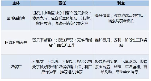 分銷型聯(lián)盟商定位:主要依靠自己的配套資源,將區(qū)域整體劃分區(qū)域,對終端進(jìn)行分銷,相互之間不得跨區(qū)域銷售。此類型聯(lián)盟商是具備分銷能力,配備專職團(tuán)隊(duì)的品牌聯(lián)盟商,按區(qū)域劃分“地盤”把區(qū)域市場氛圍若干小區(qū),每個(gè)區(qū)域終端店由專職聯(lián)盟商負(fù)責(zé)配送,原則上按照區(qū)域市場內(nèi)的主干道劃分,根據(jù)聯(lián)盟商能力而定。