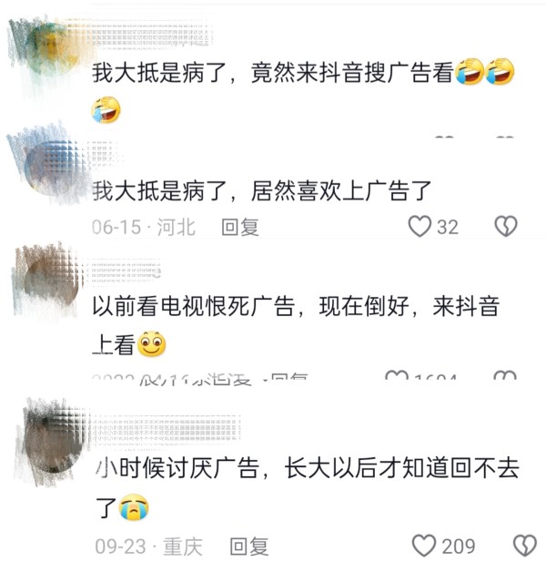近兩年,越來越多的網友開始懷念起兒時的老廣告,即便已經過去十幾二十多年,很多廣告詞對70、80、90后而言,仍然能夠張口就來。有網友表示,“小時候這些廣告出來只覺得煩,現在回憶起來覺得都好看”;也有網友調侃道,“我大抵是病了,竟然來抖音搜廣告看”。