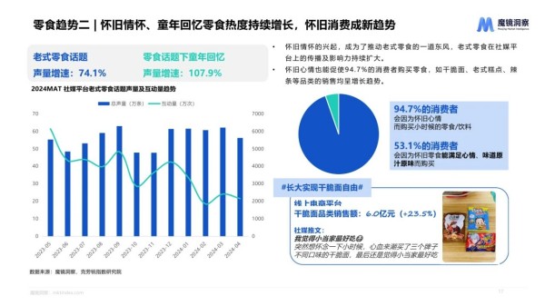 據千瓜調研數據顯示,近兩年小紅書上關于“懷舊”的筆記數、互動量持續位于高位,季度互動量均為上億量級。而魔鏡洞察發布的《2024休閑零食市場趨勢洞察報告》顯示,老式零食話題的聲量增速達到74.1%,零食話題下童年回憶的聲量增速達到107.9%。此外有94.7%的消費者會因為懷舊心情購買小時候的零食,53.1%的消費者會因為懷舊零食能滿足心情、味道原汁原味而購買。