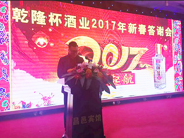 2月6日,乾隆杯酒業在駐地濰坊昌邑賓館舉行了2017年新春答謝會。新組建的領導層及品鑒級乾隆杯等多款戰略新品亮相,此次規模較大的答謝會,參與者涵蓋昌邑市領導以及具有較大影響力的經銷商等。