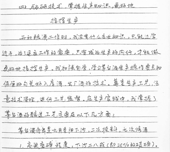“那時,這個車間沒有車間主任,沒有什么酒師。是我組織和安排酒庫班有關人員在副廠長李興發的分管下,長時間的摸索得出醬香、窖底、醇甜三種香型酒……”在李先鈞的自我鑒定中,他這樣寫道。